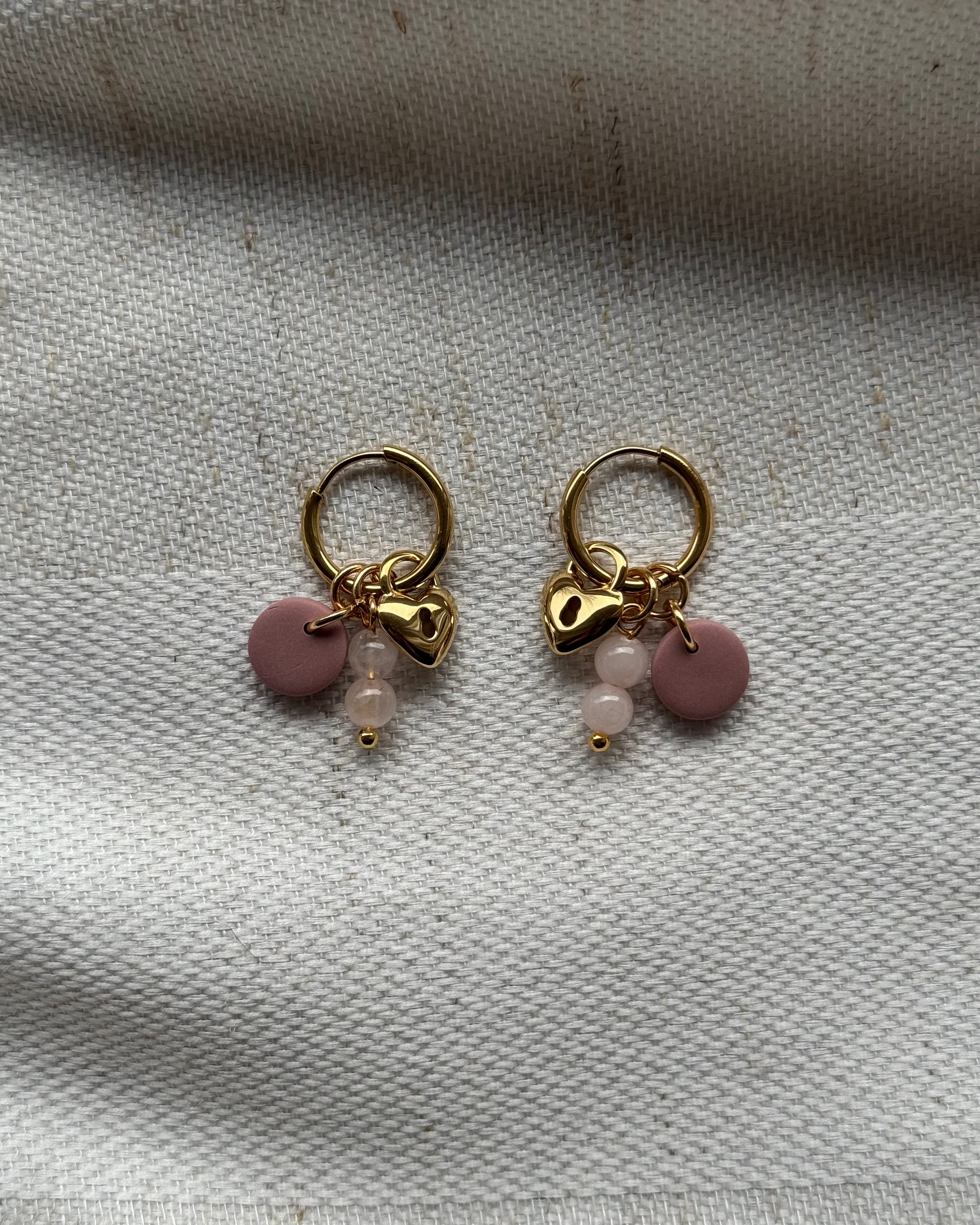 • Kleiner Herzanhänger aus Edelstahl, vergoldet, Rosenquarzperlen sowie Polymertonanhänger in rosa