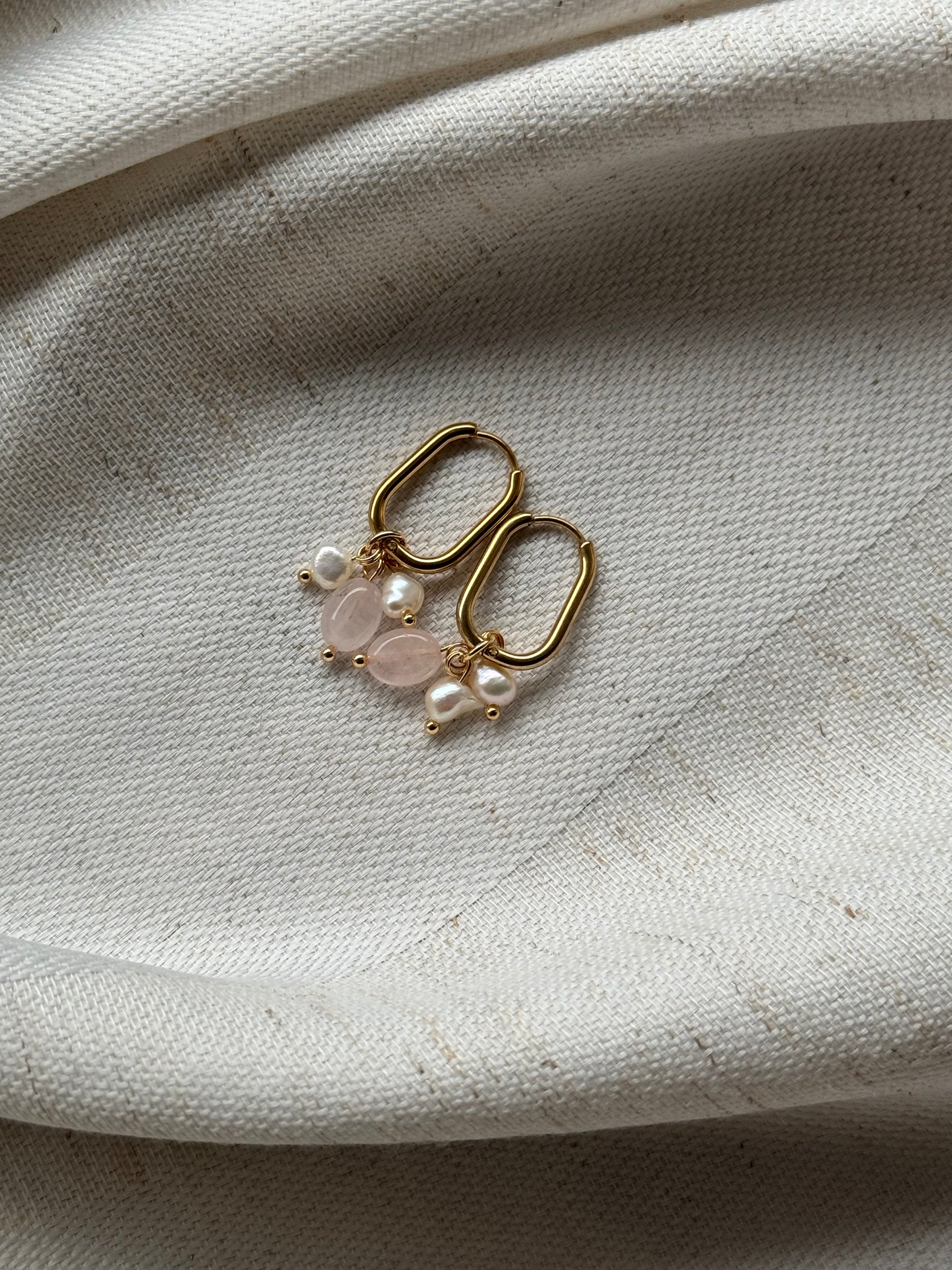 Diese stilvollen Kreolen sind der perfekte Begleiter für jeden Anlass. Gefertigt aus hochwertigem Edelstahl, bringen sie nicht nur schlichte Eleganz, sondern auch einen Hauch von Natürlichkeit in deinen Look. Die Ohrringe sind mit einem ovalen Rosenquarz-Anhänger und zwei kleinen, zarten Süßwasserperlen verziert – eine Kombination, die Leichtigkeit und Stil auf einzigartige Weise vereint.