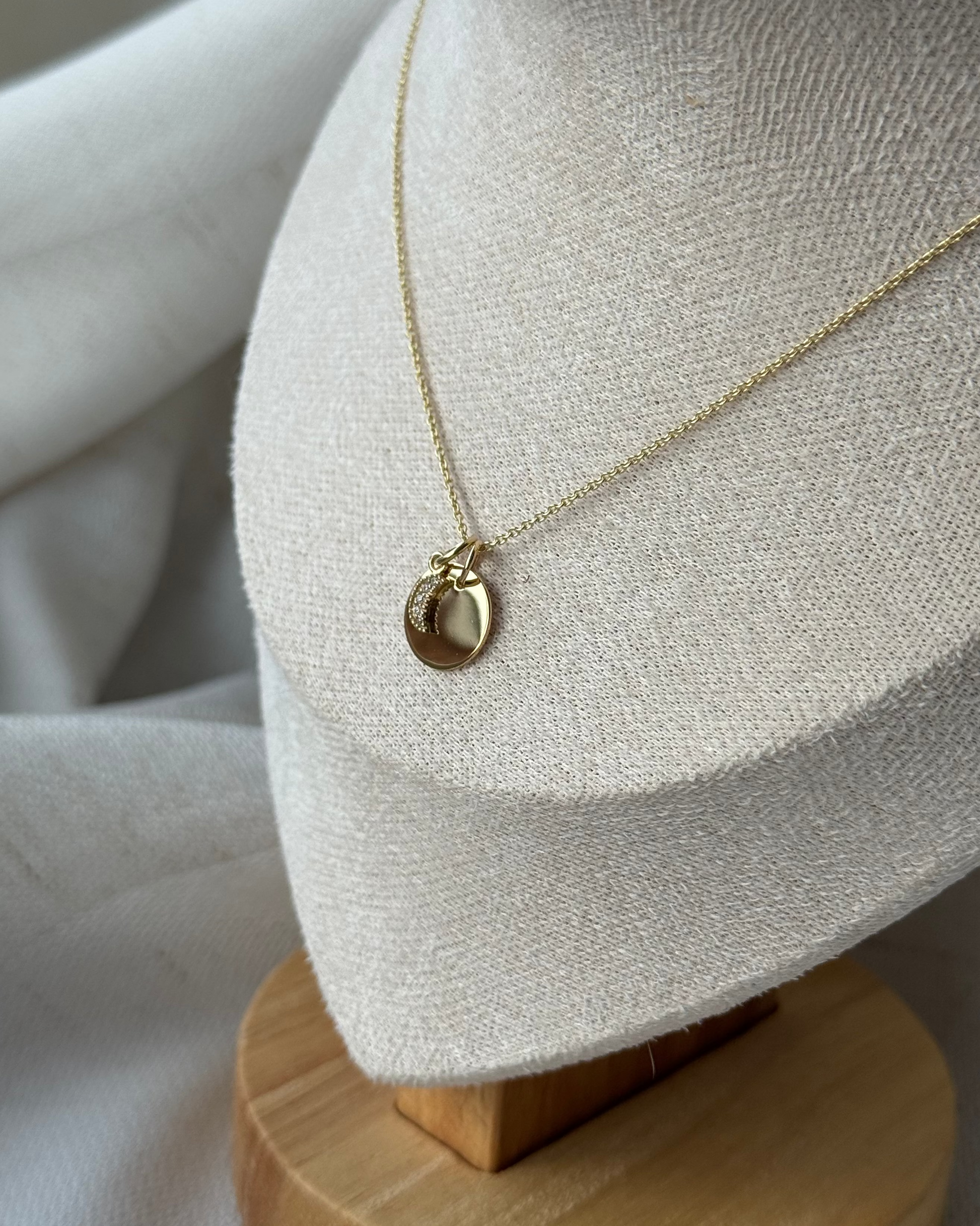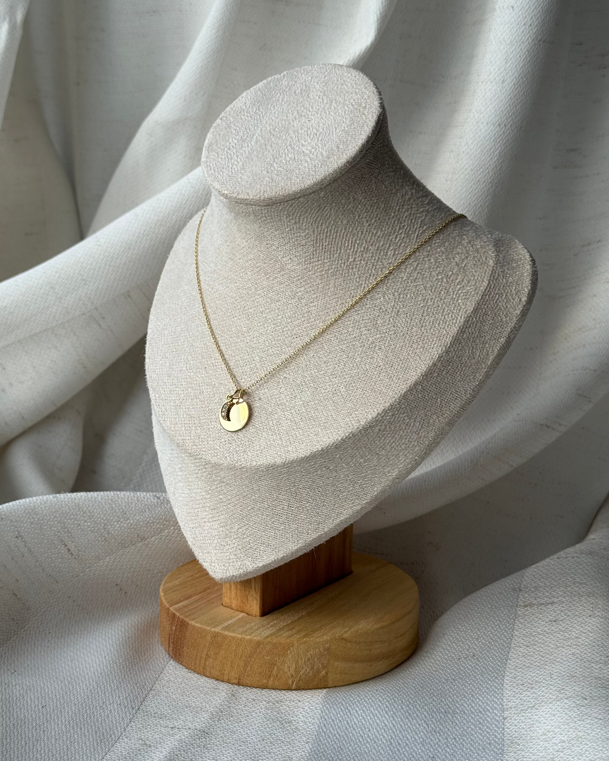 Diese feine Kette mit rundem Coin- und Mond Anhänger ist ein zeitloses Schmuckstück mit persönlicher Bedeutung. Durch ihr minimalistisches Design passt sie zu jedem Look , ob im Alltag oder zu besonderen Anlässen. Der Coin kann individuell mit bis zu 4 Buchstaben gestaltet werden und macht die Kette zu einem ganz persönlichen Begleiter oder einem liebevollen Geschenk.