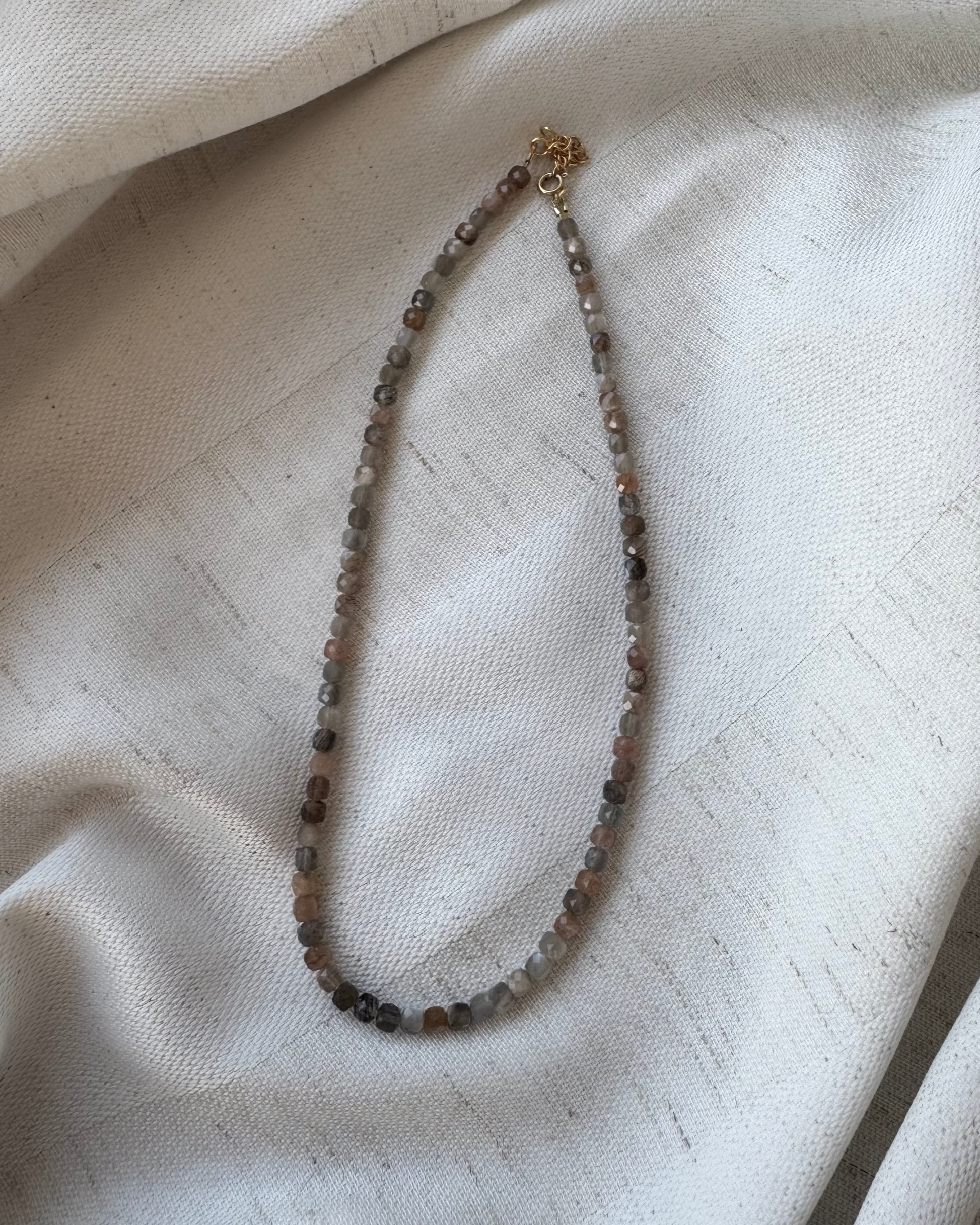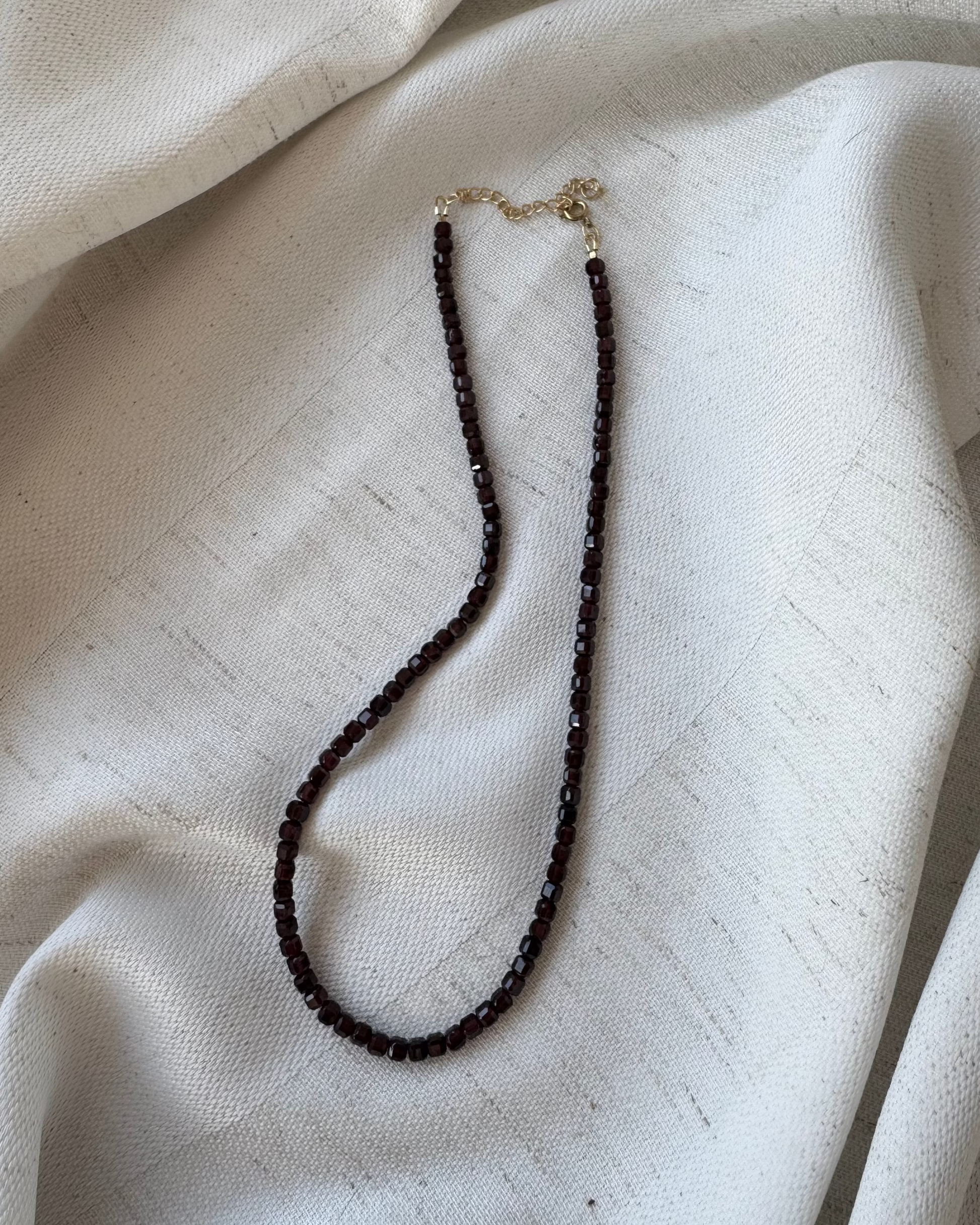 Diese handgefertigte Kette vereint natürliche Schönheit mit zeitloser Eleganz. Wähle zwischen zwei Varianten: warme, schimmernde Granat (bordeauxrot) oder sanfte, erdige Calcite-Perlen in Beige. Beide Edelsteine sind facettiert und in Würfelform von 4x4mm gearbeitet und reihen sich harmonisch zu einer klassischen Form. Mit 40 cm Länge plus 5 cm Verlängerung sitzt die Kette angenehm am Hals und lässt sich vielseitig kombinieren , von alltagstauglich bis festlich.