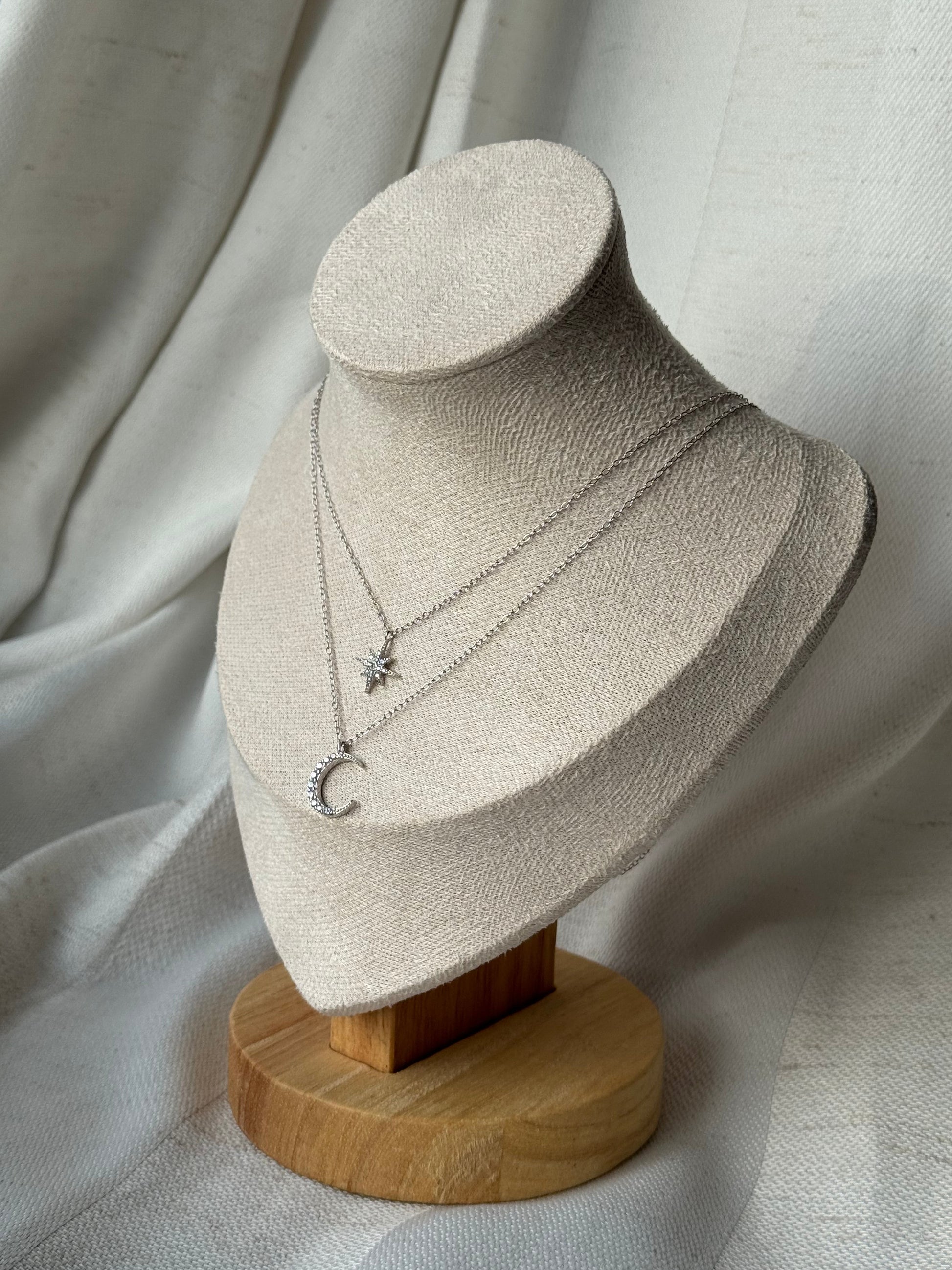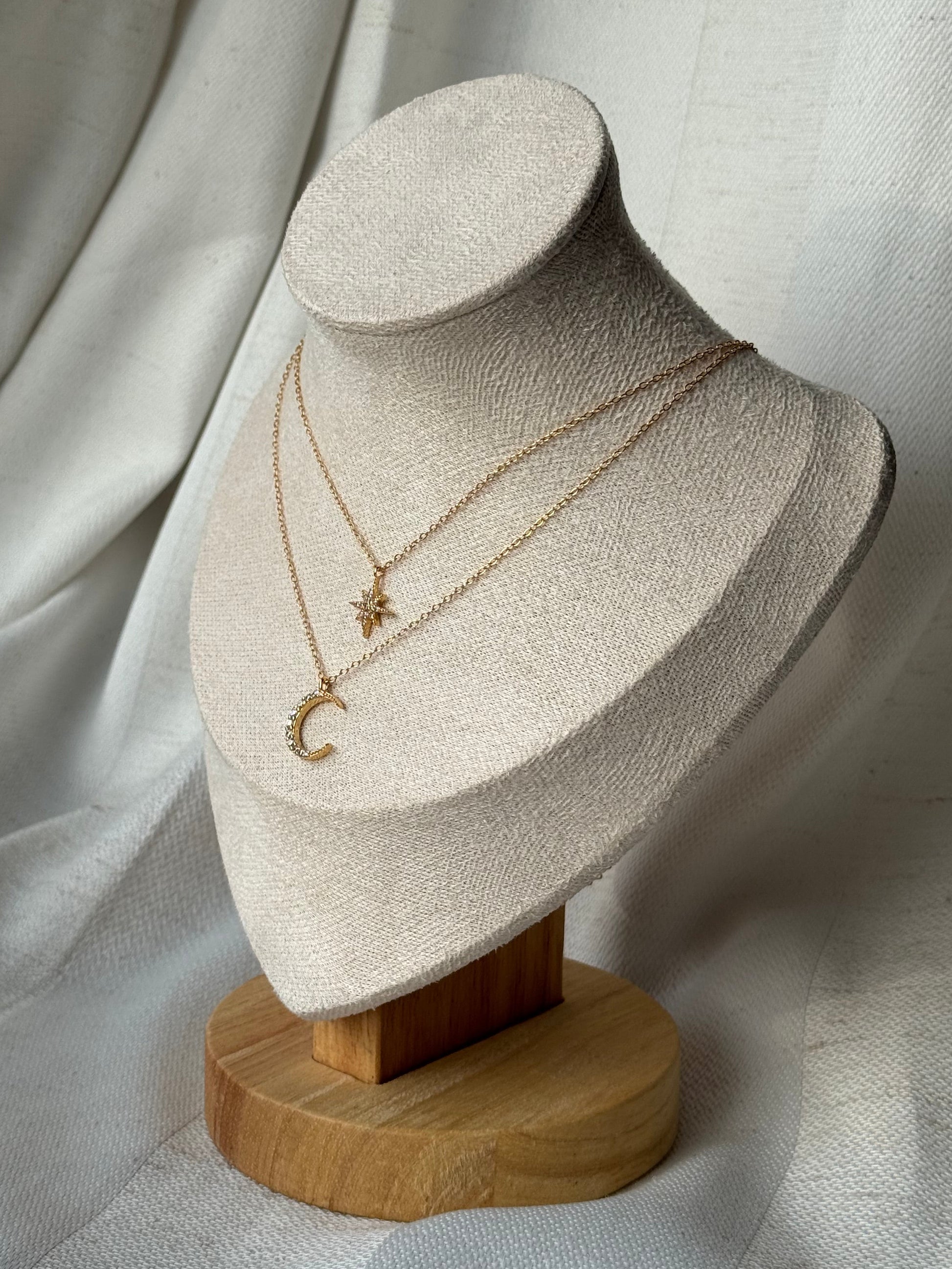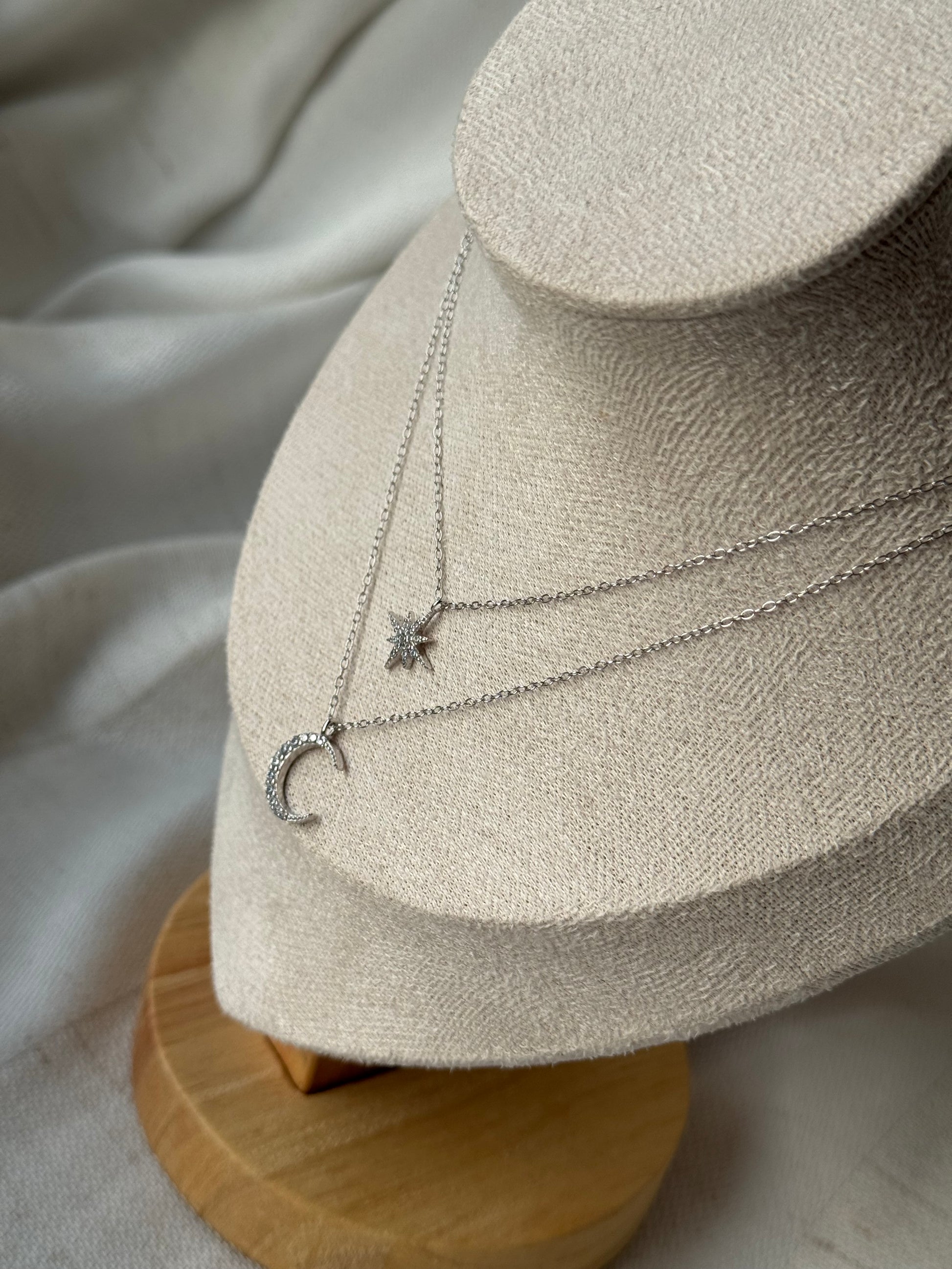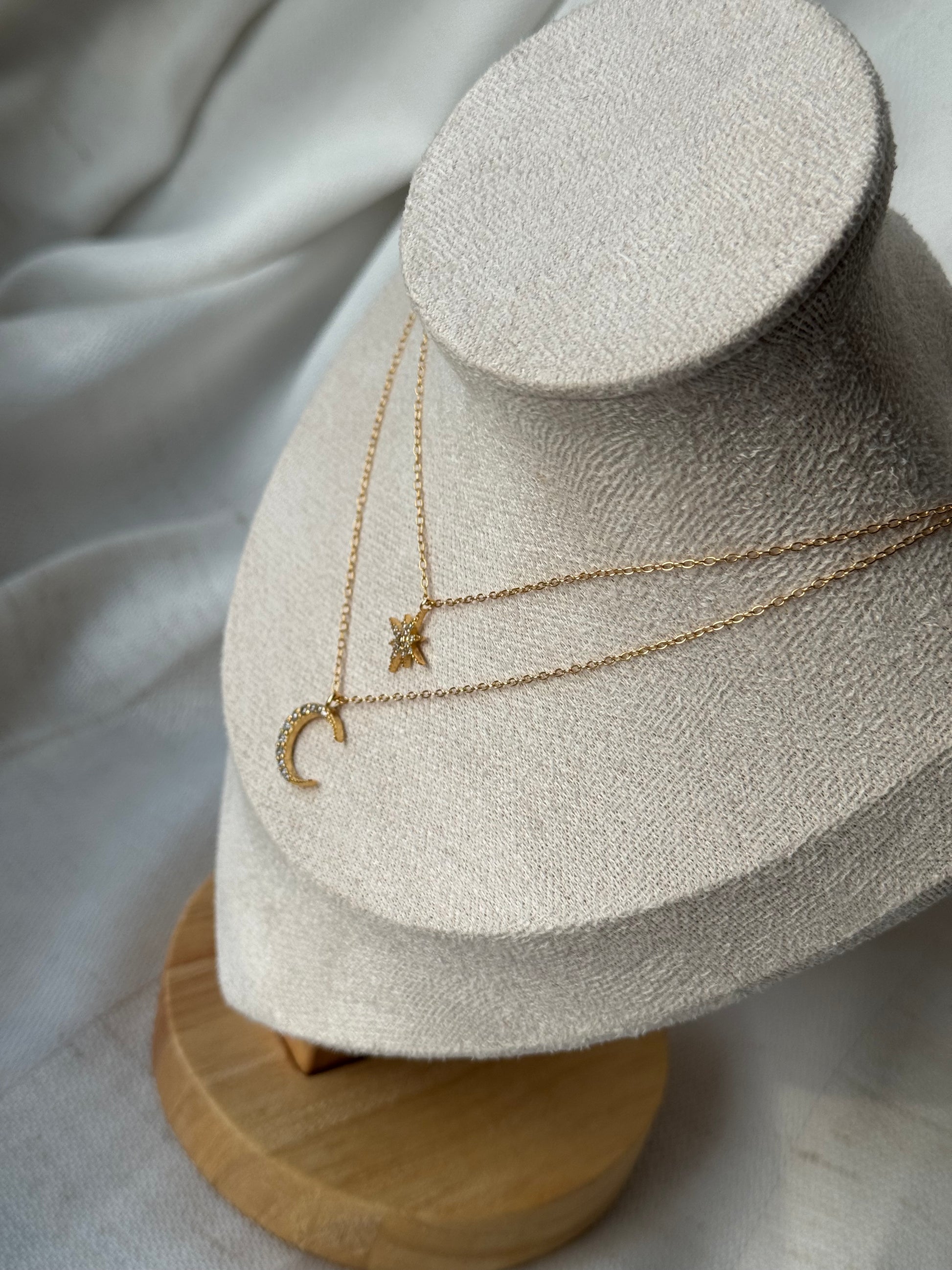 Eine stilvolle, himmlisch schöne Doppel-Halskette, die sich perfekt für den Alltag, besondere Anlässe oder als Geschenk eignet. Durch die Kombination aus Stern und Mond entsteht ein harmonischer Layering-Look, der jedes Outfit veredelt. Leicht, hochwertig und angenehm zu tragen – ein Schmuckstück, das zeitlose Eleganz mit modernem Design verbindet.