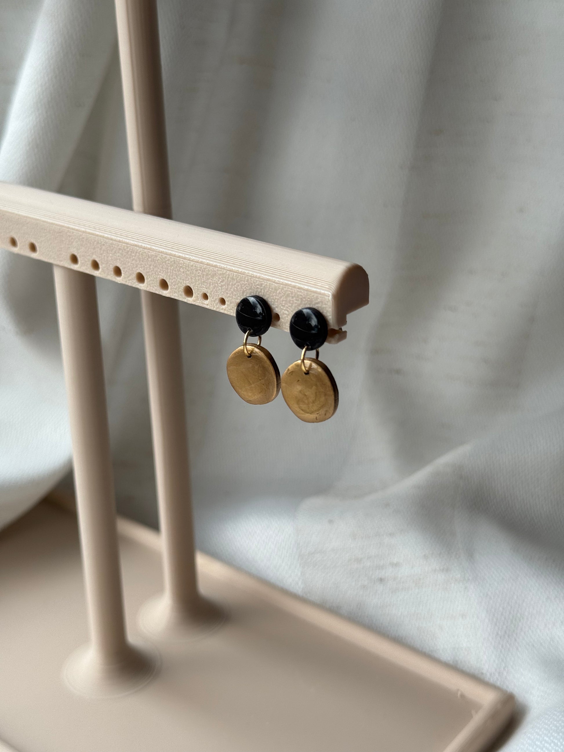 Diese minimalistischen Polymerton-Ohrringe vereinen klare Formen mit einem edlen Akzent. Ein schwarzer Kreis im oberen Bereich trifft auf einen goldfarbenen Nugget-Anhänger aus Polymerton und sorgt für einen modernen, aber dennoch zeitlosen Look. Durch ihre kompakte Größe wirken die Ohrringe dezent und elegant, setzen jedoch gleichzeitig einen stilvollen Hingucker, perfekt für den Alltag wie auch für besondere Anlässe. Die Oberfläche ist sorgfältig mit Resin (Harz) veredelt, was den Schmuckstücken eine glatte, hochwertige Optik und zusätzliche Langlebigkeit verleiht.