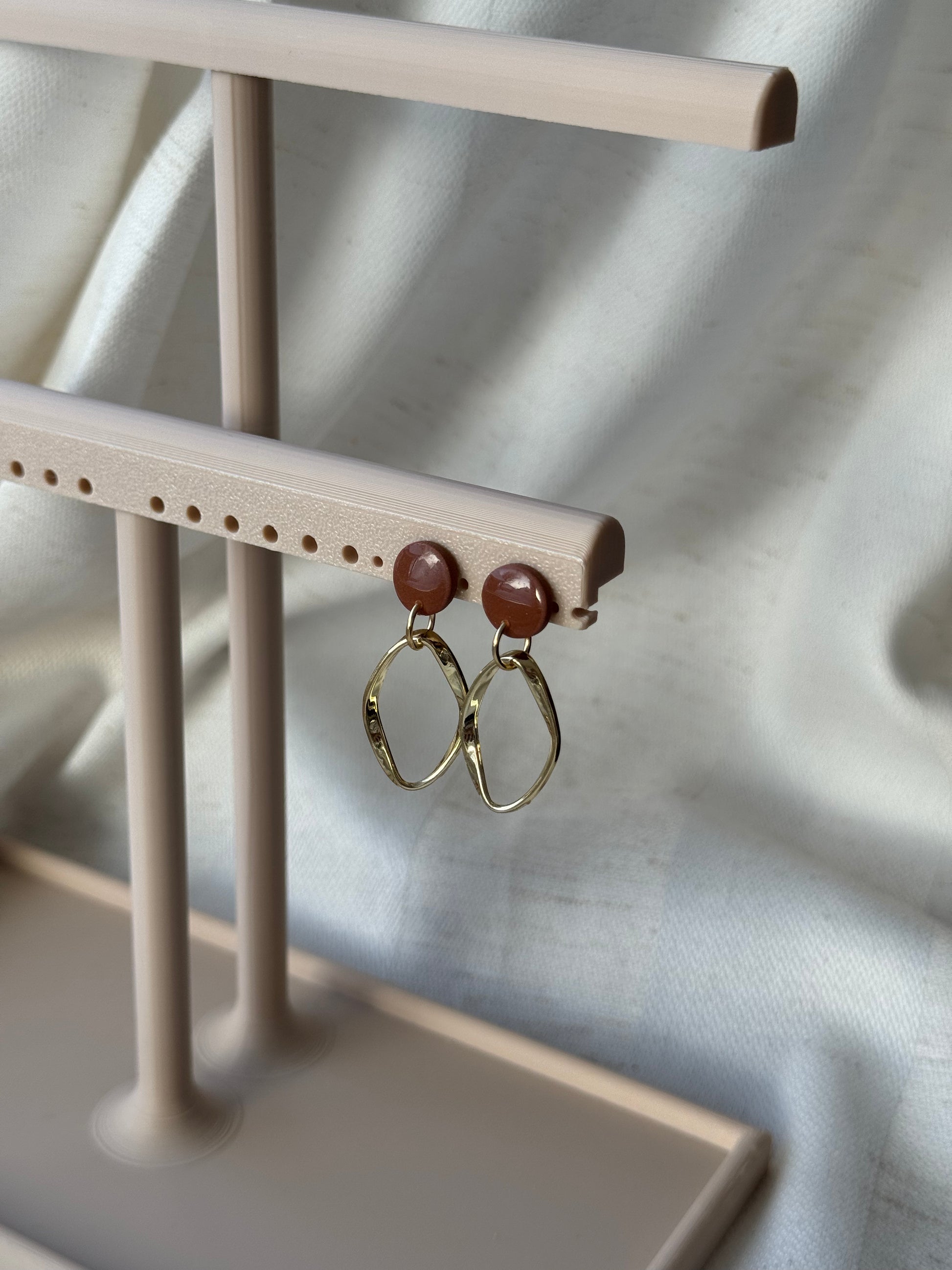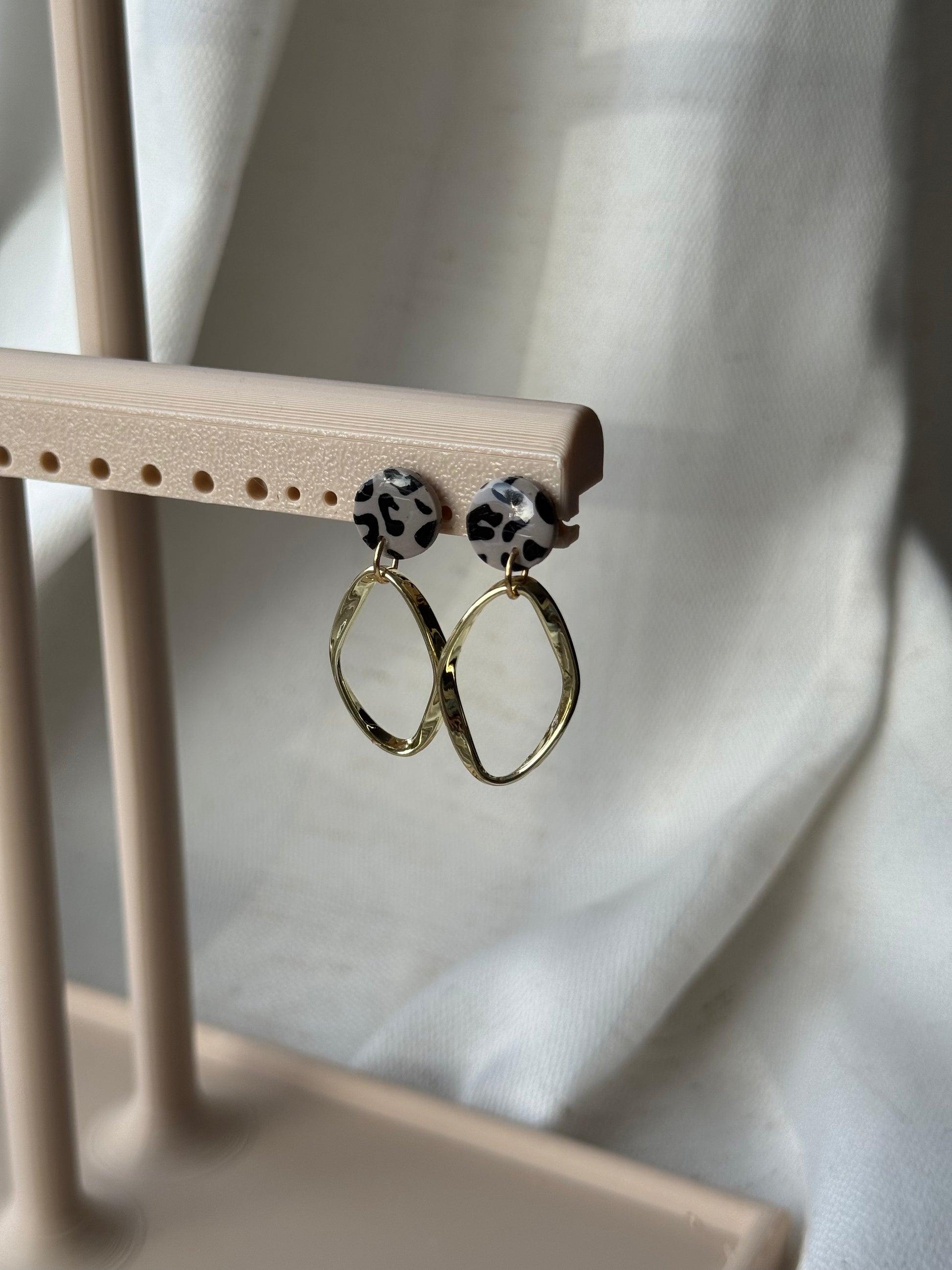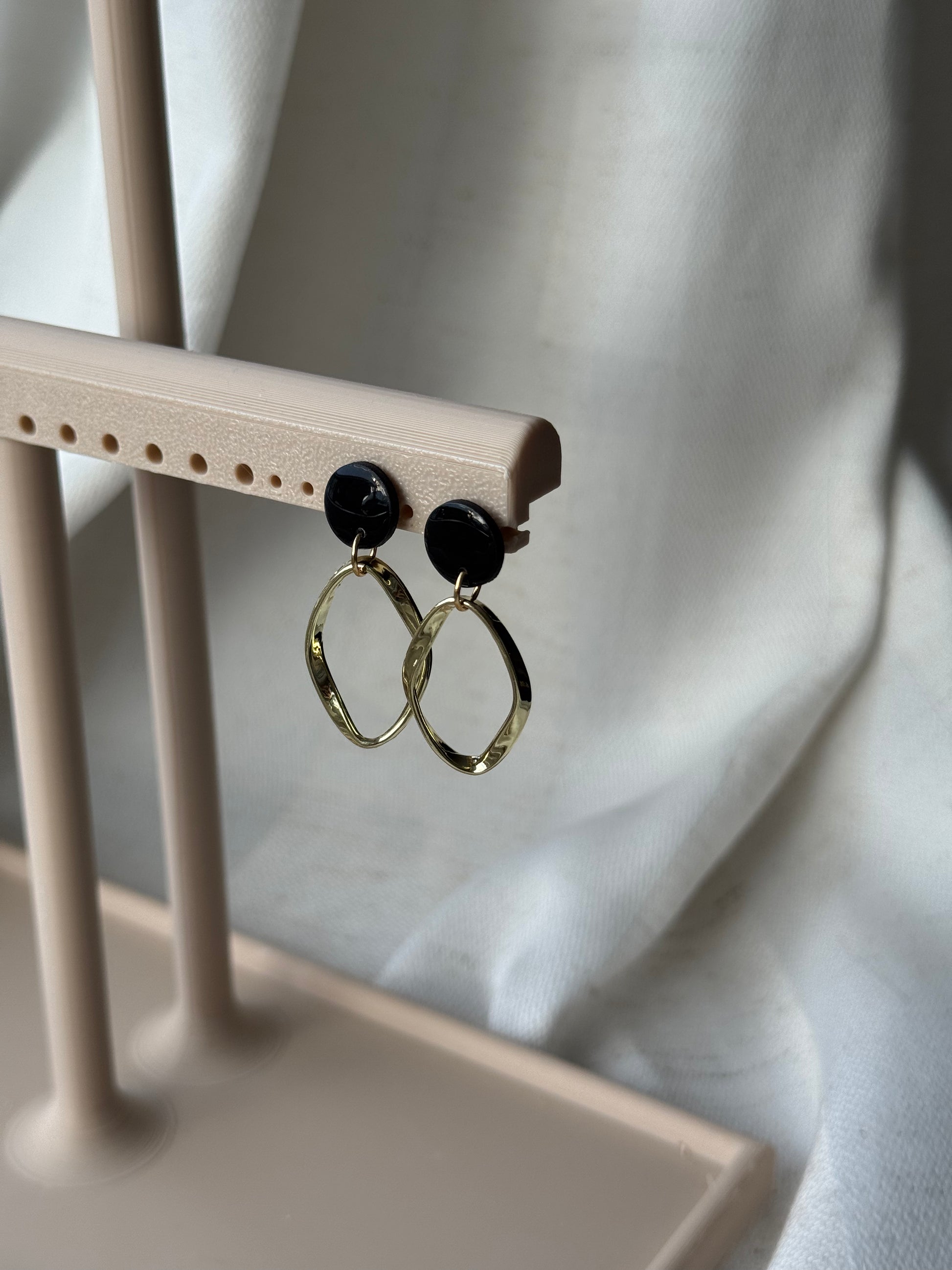Diese Ohrringe verbinden modernes Design mit klarer Formensprache. Der mit Resin veredelte, glänzende Polymertonstecker setzt einen edlen Akzent und bildet einen harmonischen Kontrast zum gedrehten, goldfarbenen Ovalring. Durch die bewegliche Aufhängung entsteht bei jedem Tragen eine leichte, elegante Dynamik.