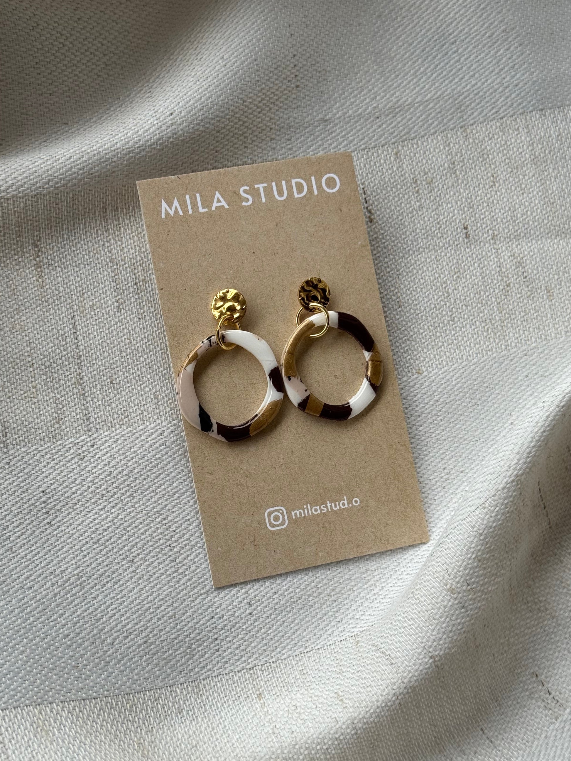 Diese handgefertigten Kreisohrringe vereinen modernes Design mit einem Hauch von Vintage-Charme. Die Kombination aus warmen Erdtönen und goldenen Akzenten sorgt für ein stilvolles Statement, das sowohl im Alltag als auch zu besonderen Anlässen perfekt zur Geltung kommt. Ihr einzigartiges Terrazzo-Muster macht jedes Paar zu einem echten Unikat.